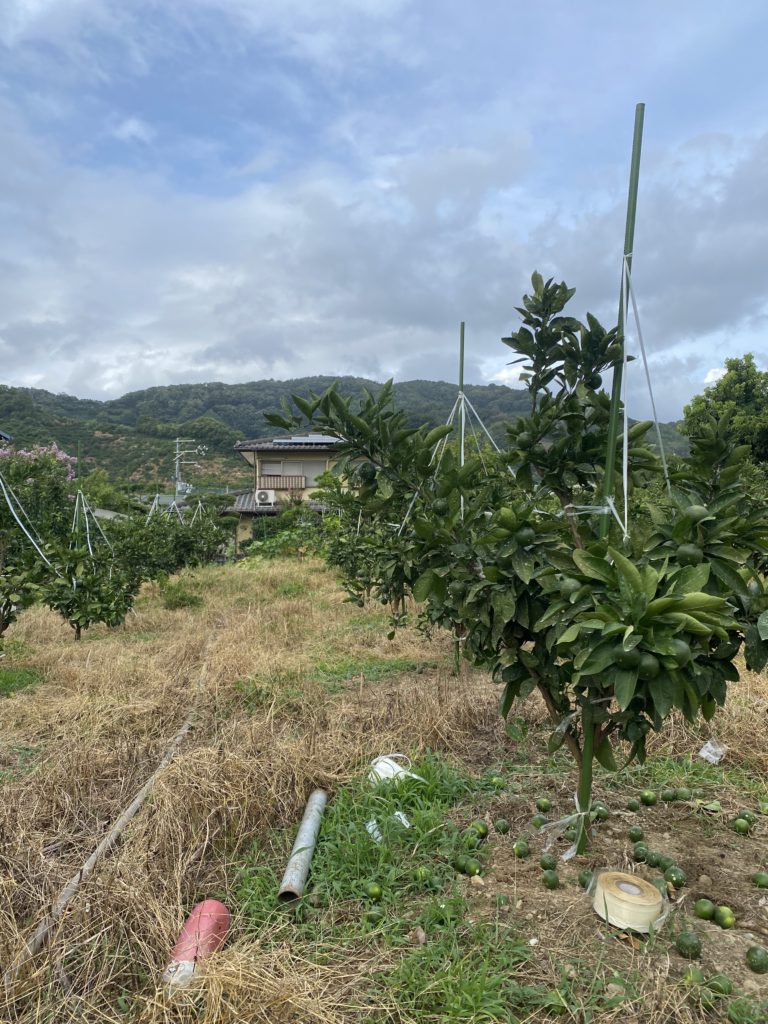 6月中は実が着き過ぎている木を枝別(大人の親指くらいの太さの枝)に全摘果して夏芽を出させます。7月は由良早生の摘果をして枝吊りをしました。